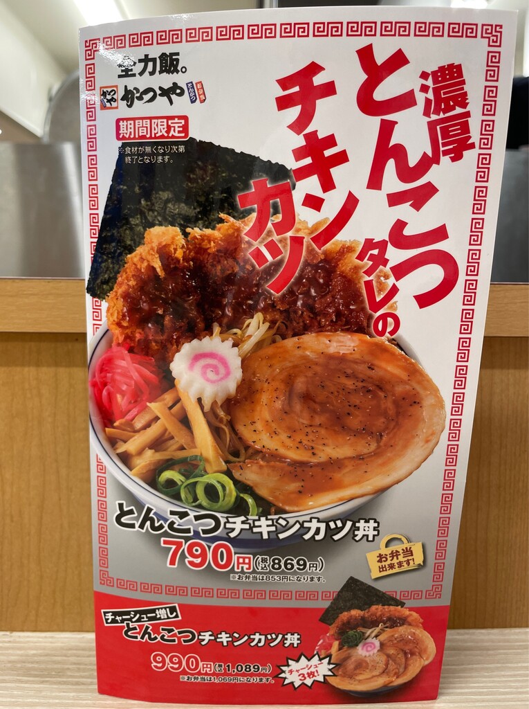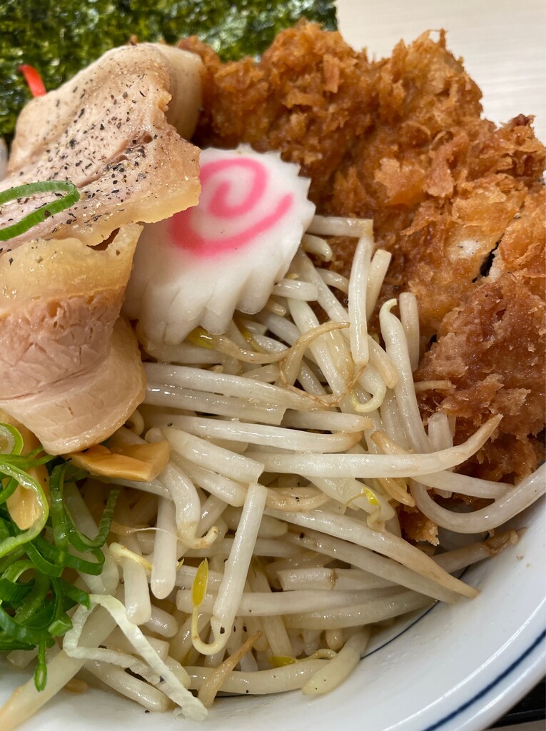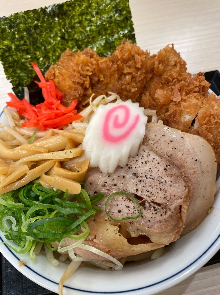 チキンカツの横にはチャーシュー、メンマ、ナルト