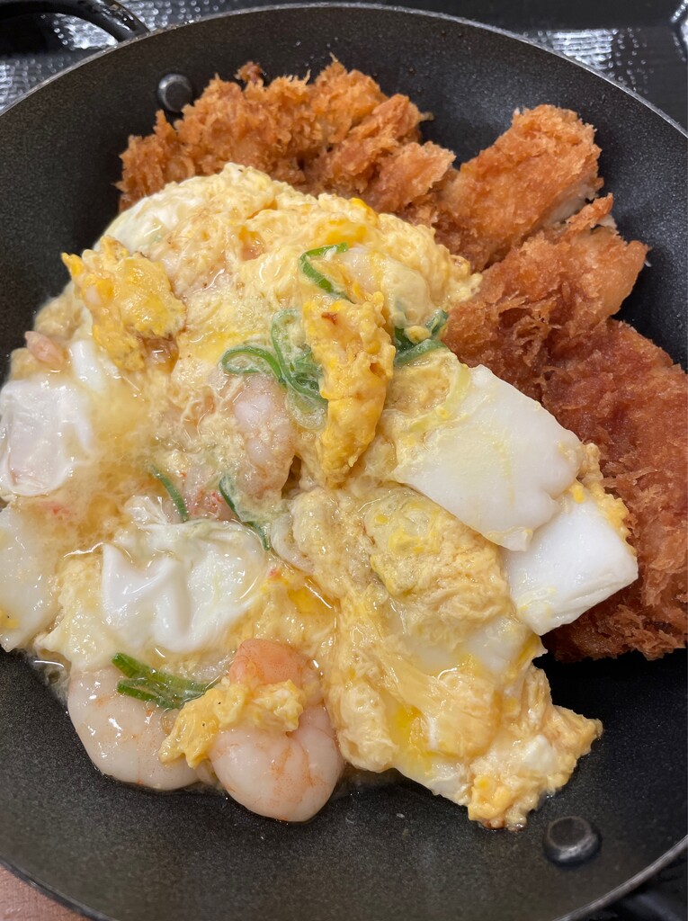 かつや@豊川・御油で、海鮮たまごチキンカツ定食(とん汁大)。