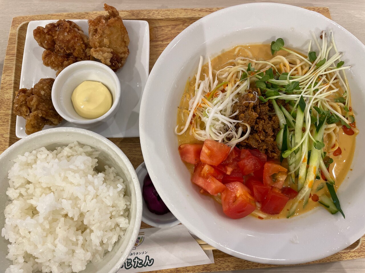 メインの冷やし担々麺にご飯と唐揚。