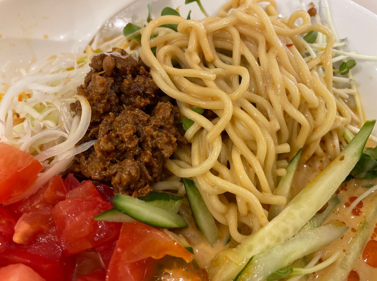 トッピングはトマト、キュウリに挽肉。