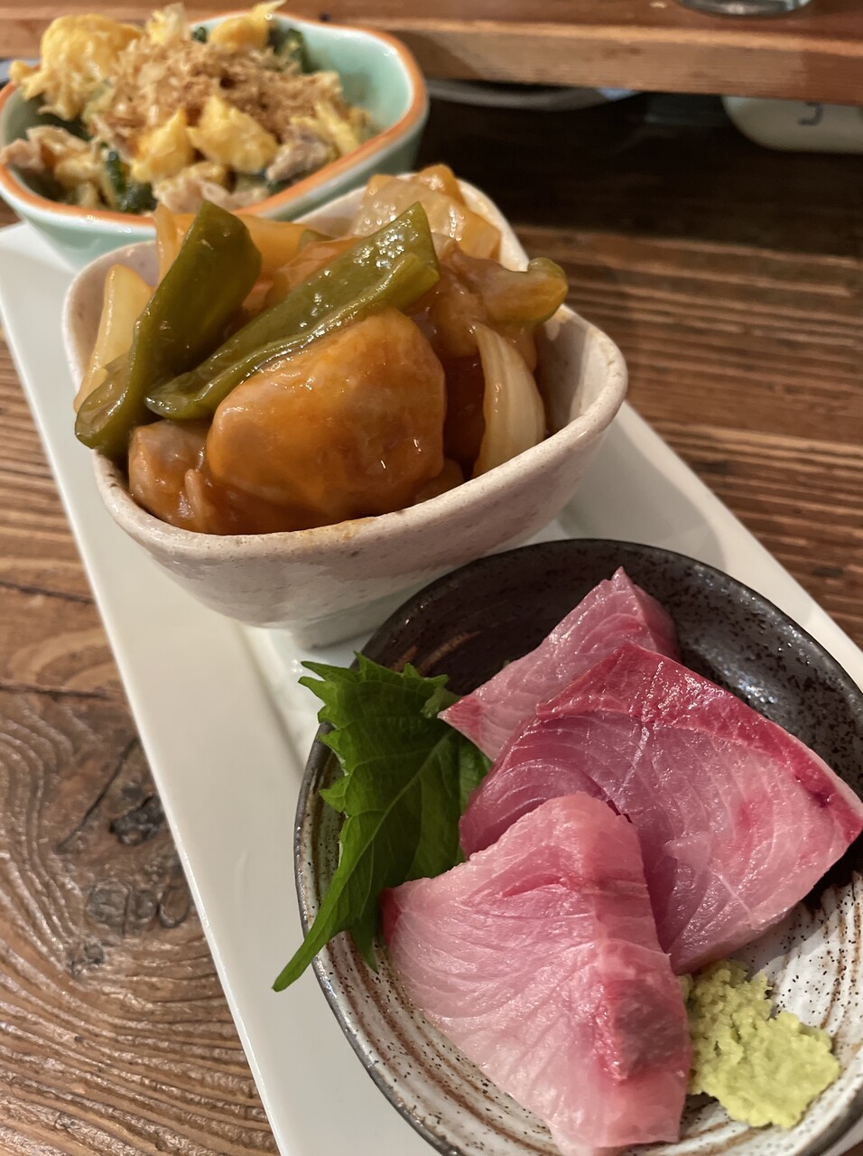 やいちゃん@名古屋・伏見で、三種盛り+日本酒ほか。