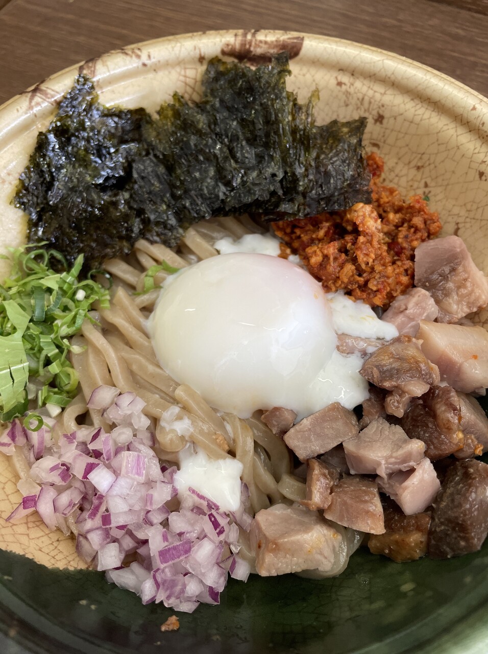 刻みチャーシュー、台湾ミンチ、タマネギ、半熟玉子など。