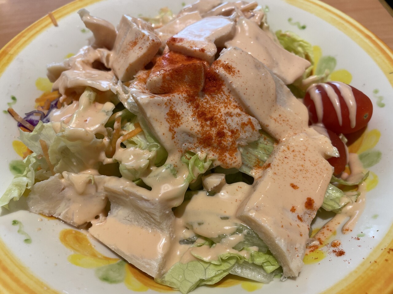 まずは”白ワイン”に”チキンのサラダ”。