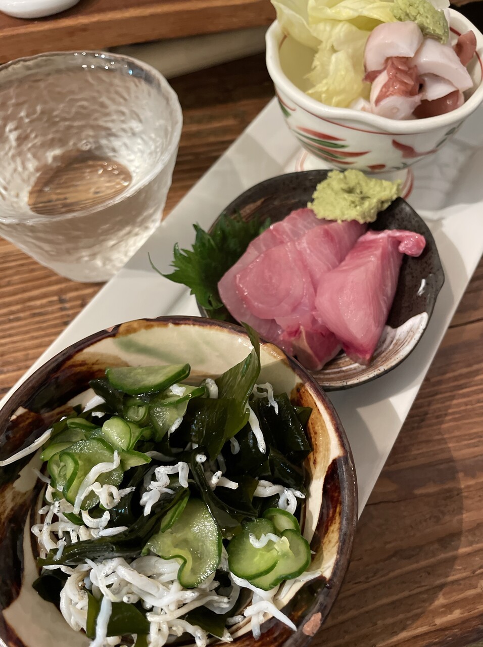 たこぶつ、天然はまち刺、しらすとワカメ酢のもの。
