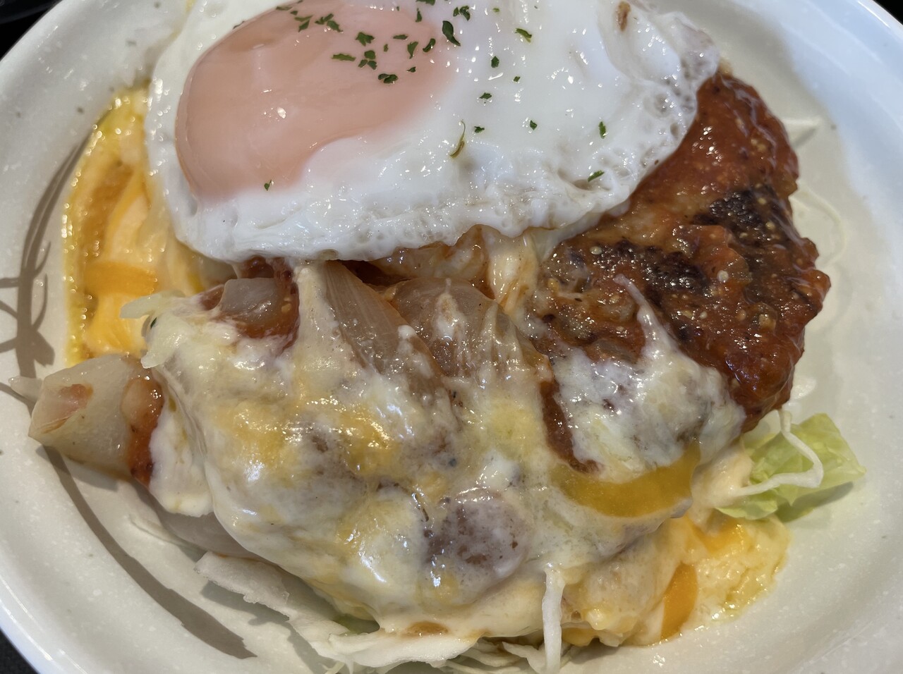 ご飯の上にレタスなどの野菜にハンバーグと目玉焼き。