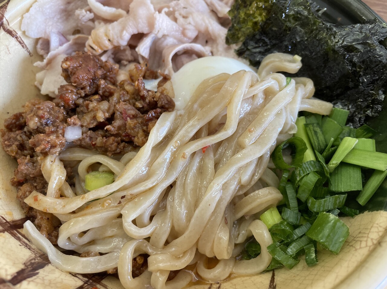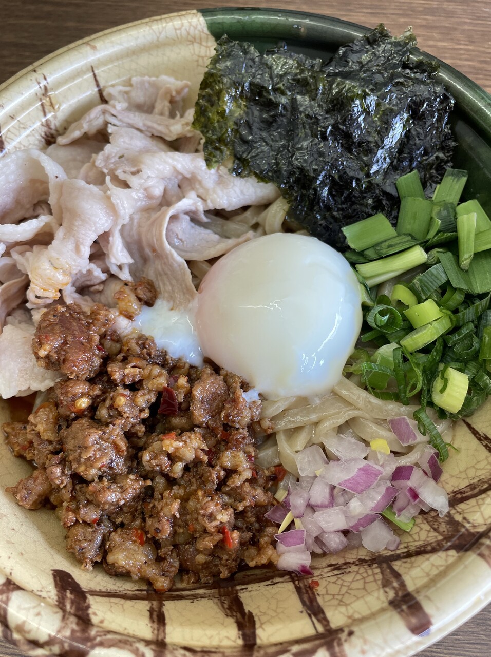 豚しゃぶ、ピリ辛挽肉、刻みタマネギ、温玉に